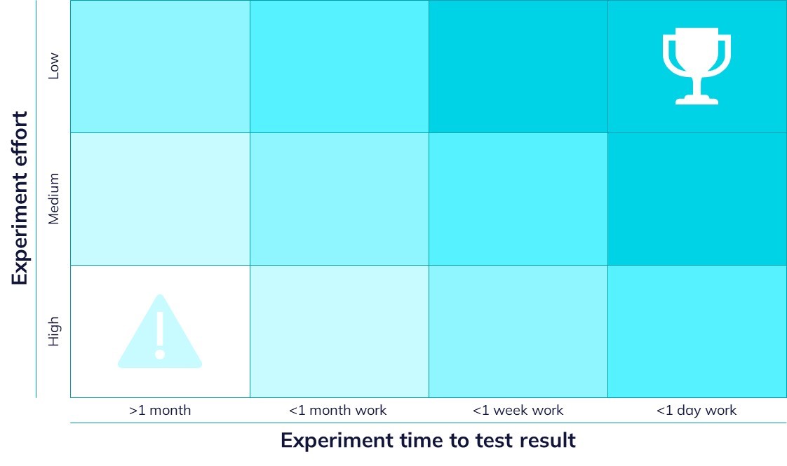 You can skip this step. But it can also be the most valuable step. Use all your brainpower, ingenuity and creativity to make the experiments smaller. What’s the simplest thing you can do to find out if your idea is valuable? Of course, there is a trade-off when you reduce effort and increase speed that can also reduce learning insights. So, this is the most important trade-off you need to make. Adjust the position of the ideas on the matrix with these smaller experiments.
